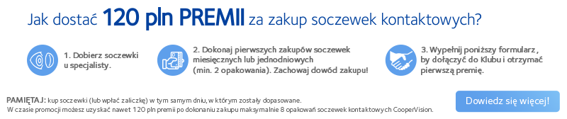 Wielkie zmiany nie wymagają rewolucji. Czasami wystarczy mały krok. Masz już go za sobą. Specjalista wybrał odpowiednie dla Ciebie soczewki kontaktowe z szerokiej gamy produktów CooperVision. Dziękujemy i gratulujemy wyboru! Dzięki doskonałym soczewkom CooperVision poczujesz komfort i prawdziwą swobodę użytkowania. Będziesz oddychać wolnością oraz cieszyć się ostrością widzenia i niespotykanym komfortem każdego dnia.